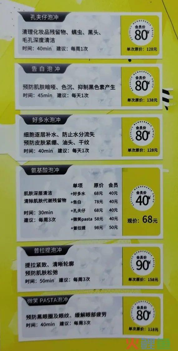 以洗脸猫的价格为例,其共有6种服务项目,主要围绕深层清洁、补水保湿、美白嫩肤、淡化细纹、预防松弛进行,一个项目通常一小时左右,价格在60-150元之间。