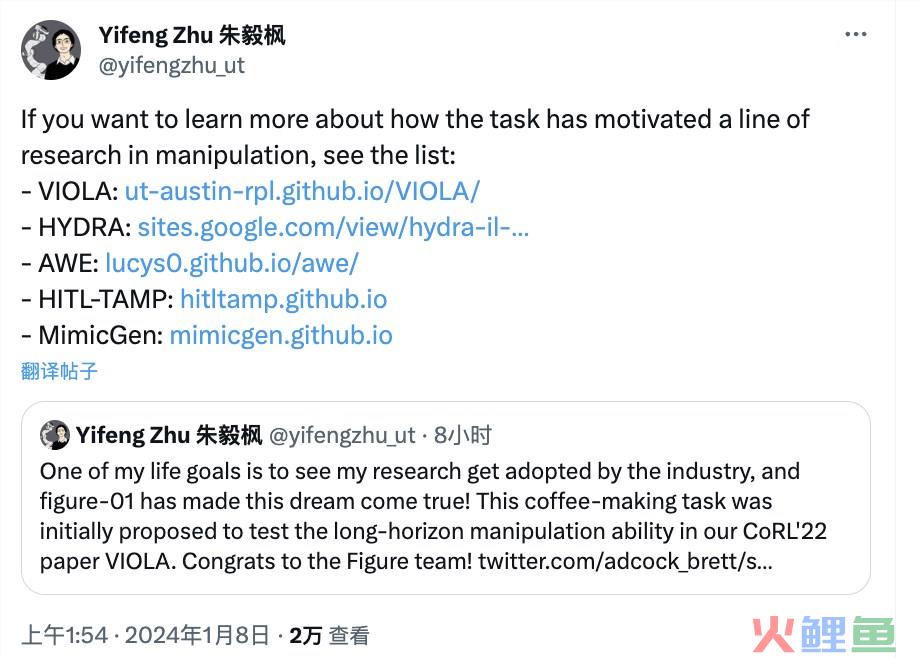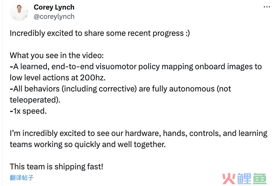 对此,前谷歌DeepMind研究员(也是该机器人的开发人员)直接就是一个转发点赞,并再次强调: