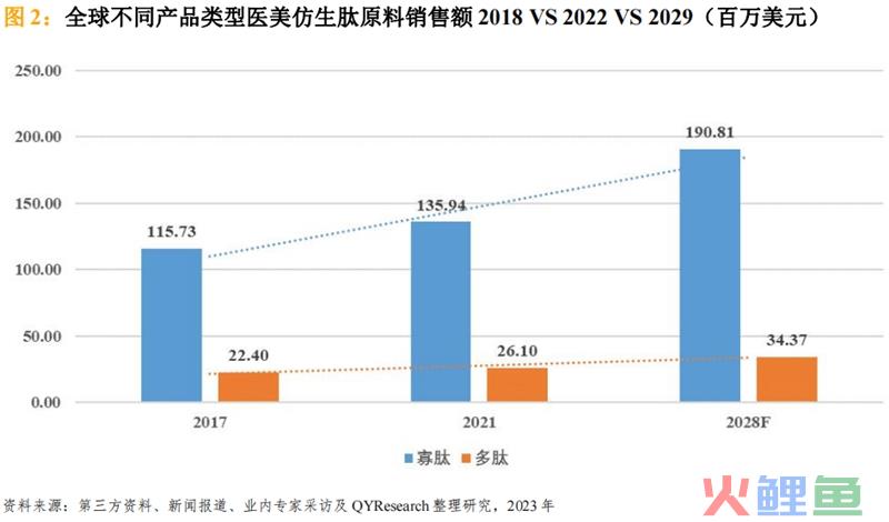 其实在医美领域,肽的应用由来已久,从 20 世纪末到现在已有约 30 年的历史;随着多肽化妆品原料在众多品牌产品中广泛应用,消费者的关注度和认知程度不断提升,该市场预计存在巨大潜力。根据 QYResearch 显示,2022 年全球多肽行业市场规模已经超过 2000 亿元,未来还将加速增长,仿生肽也是其中一种。