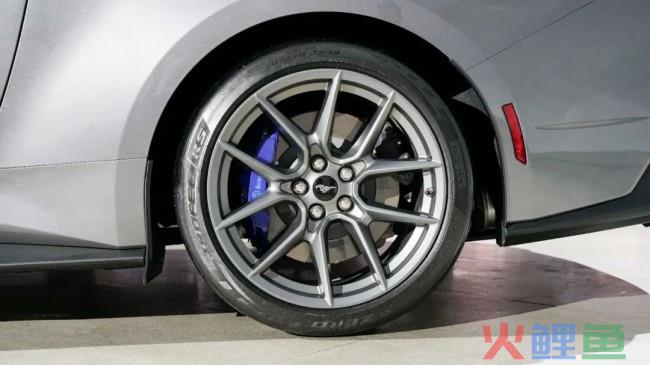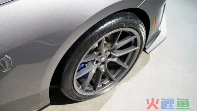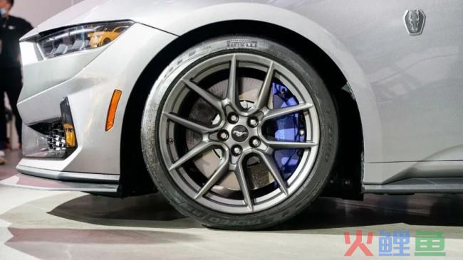 轮胎方面,现场这辆展车采用了 19 英寸轮圈,并配备前305/30 ZR19、后315/30 ZR19 规格的倍耐力P ZERO PZ4 轮胎。刹车部分,新款福特跑车Mustang Dark Horse采用Brembo前6、后 4 活塞卡钳,以及前直径390mm、后355mm的通风刹车盘。在外媒的测试中,Mustang Dark Horse 96-0km/h的刹停距离仅为26. 2 米,数据相当抢眼。