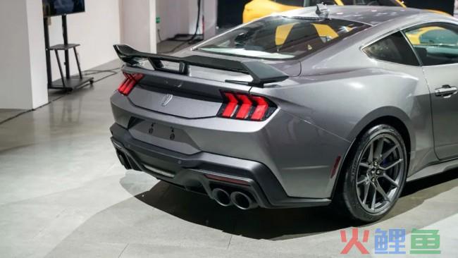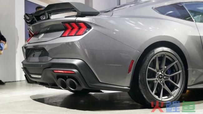 在车尾的设计上,新车最 大的亮点就是配备了硕大的固定式尾翼,以及造型更有竞技风格的后包围。另外,跟EcoBoost、GT系列不同的是,Dark Horse尾标也换成了专属的徽标。