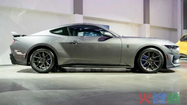 来到车身侧面,新款福特跑车Dark Horse延续了Mustang家族经典的设计,修长的机盖、前悬、以及较长的L113 距离,彰显了大排量车独有的气质。再搭配较低的侧裙和扁平的车窗,车身侧面显得十分运动。