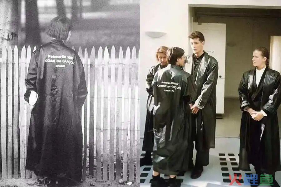 先锋设计师川久保玲一手设计的尼龙「Trench Coat」就是典型例子。她在设计自己高定工作室的员工服时,将原本的白大褂变成了黑色有褶皱的、类似雨衣材质的长款外套,并在背面用白色粗体字母印上品牌及秀场时间。