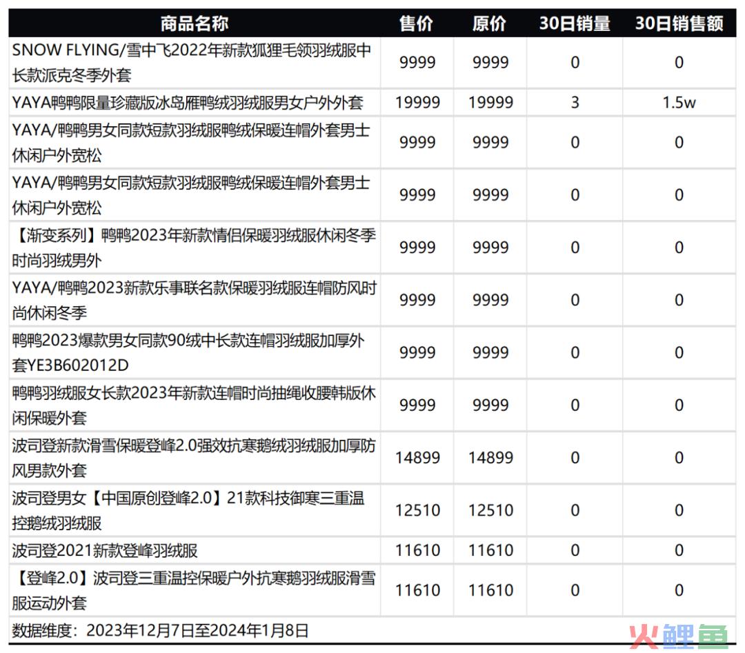 而追求“身份价值”的这部分消费者大概率不会选择原本走国民大众路线的鸭鸭、雪中飞、波司登。以抖音平台为例,鸭鸭、雪中飞、波司登万元左右天价羽绒服近30日销量均为0。