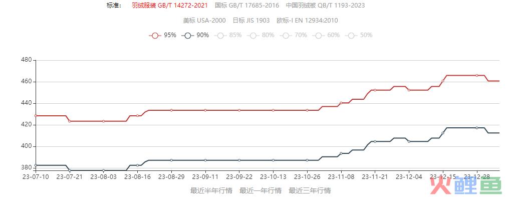 无论鸭绒还是鹅绒,价格都在一路走高。据羽绒金网的GB/T 14272-2021标准羽绒价格显示,95鹅绒和90鹅绒价格分别从2023年7月的867元/kg和790元/kg,一路分别飙涨至今年年初的957.1/kg元和873.74元/kg。