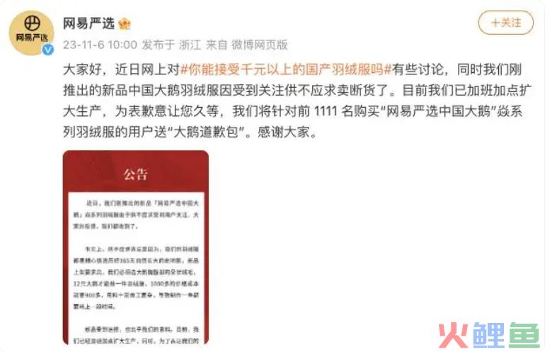 去年网易严选也在官微发布公告称,其千元羽绒服因制作工艺复杂,生产成本已达900多元。