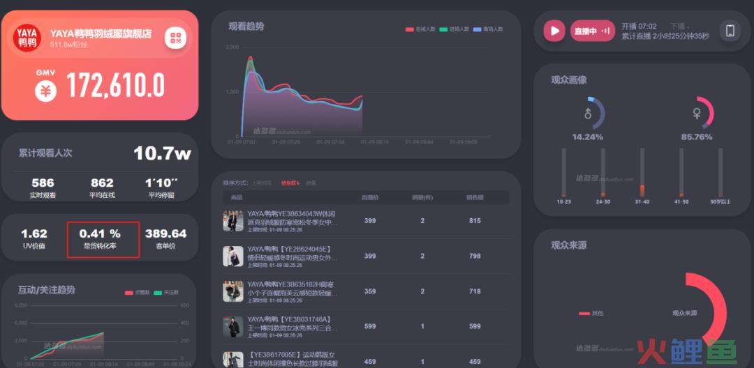 如刘杨所言,以鸭鸭羽绒服抖音官方旗舰店1月9日上午的一场直播为例,达多多数据显示,该直播间2.5小时的直播观看人数虽突破10.7万,但转化率仅有0.41%。