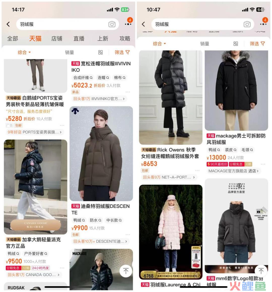 在天猫平台上,天价羽绒服仍是国际大牌的天下。如售价9500元的加拿大鹅回头客超1万+,售价8653元的Rick Owens羽绒服外套回头客超9万+。