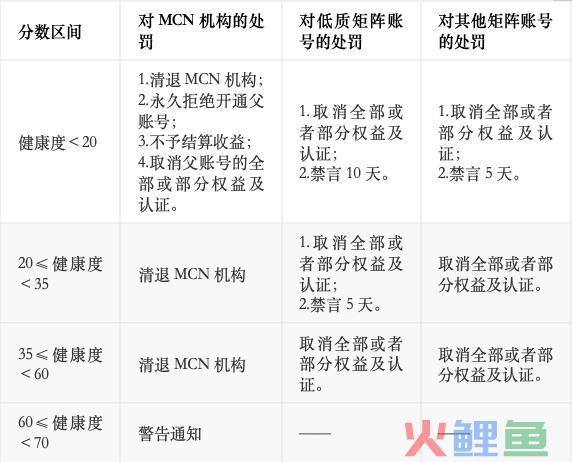 MCN机构的健康度处于以下分数区间时,平台将视情况采取以下一项或者多项相应措施: