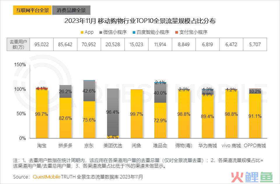 QuestMobile近日发布的2023全景生态流量年度报告显示,除了淘宝以外,拼多多、京东、美团、唯品会等电商平台,都有大量用户都来自微信小程序渠道。
