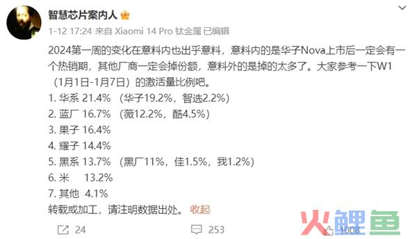 麒麟回归卖疯了!曝华为2024年首周重回中国市场销量第一:份额逼近20%