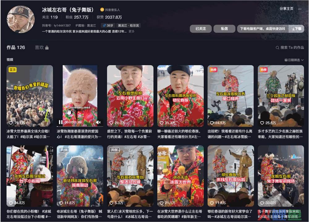 左右哥作为少有的“季节性网红”,一共发布了128个作品,其中爆款作品均是随着冰雪大世界走红而走红,我们认为他的爆款作品有以下特点: