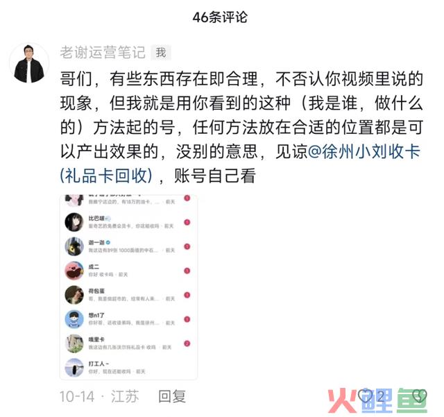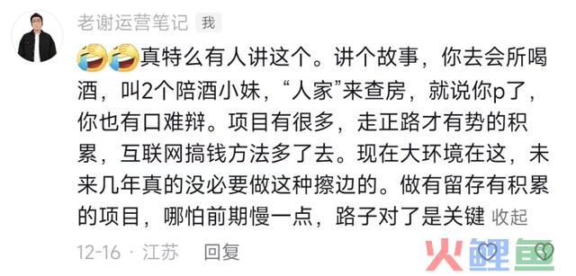 靠着评论内容来引流,有个先决条件!那就是你回复的每一条评论,在语义和语句上都不能类似或者重复,但凡做不到这点,对不起,铁定被风控。除此之外,一定要在推荐出来的对标内容去评论,而且不能是每一条推荐的对标内容都评论,控制好频率就行。对于刷出来的视频,有的可以评论,有的可以点赞、点收藏,有甚至可以点转发、点不喜欢,还是那句话模拟用户正常行为习惯就行。再来说下重点,该评论什么内容?以老谢我的网创的IP来说,如果评论的内容是和钱相关的,比如“这个项目我也做了有段时间,现在一天三四张吧……..”即使你换着不同的评论内容,但只要你的评论内容大多都是和赚钱相关,那么也很容易被风控。所以,正确的做法应该是用带有观点性的评论来截流,这种评论出来的内容,安全、有效、截流过来的用户对你的信任度也高,更有利于成交。来看几个老谢自己的截流案例截图。