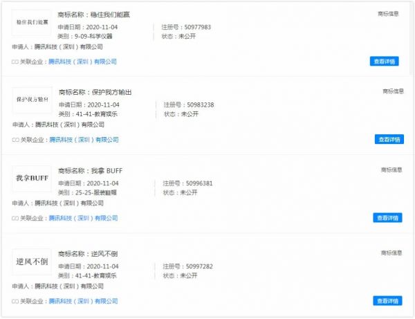 鹅厂作为2018年商标注册量第一的公司里面也有很多中二的热词商标例如一系列王者荣耀相关的热词“稳住我们能赢”“逆风不倒”“保护我方输出”“我拿BUFF”……