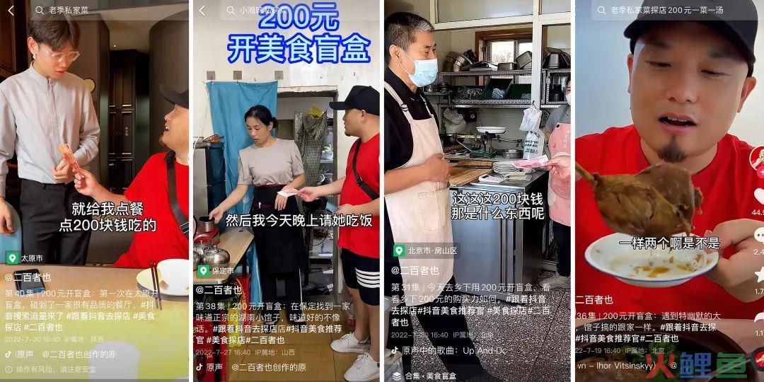 @二百者也,原名@饕餮者也,目前在其抖音账号中能看到的第一条作品发布于2021年2月20日。翻看其早期作品,都是常规的探店内容玩法,即直接去探寻不同的美食店,品尝之后给出自己的看法。由于内容模式上并未玩出新花样,这段时间账号的各项数据并不出挑,点赞量大多集中在几千左右。