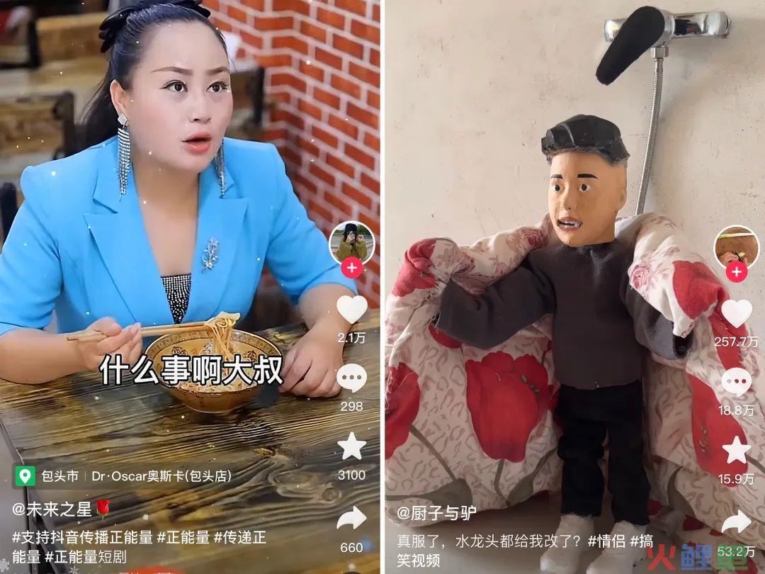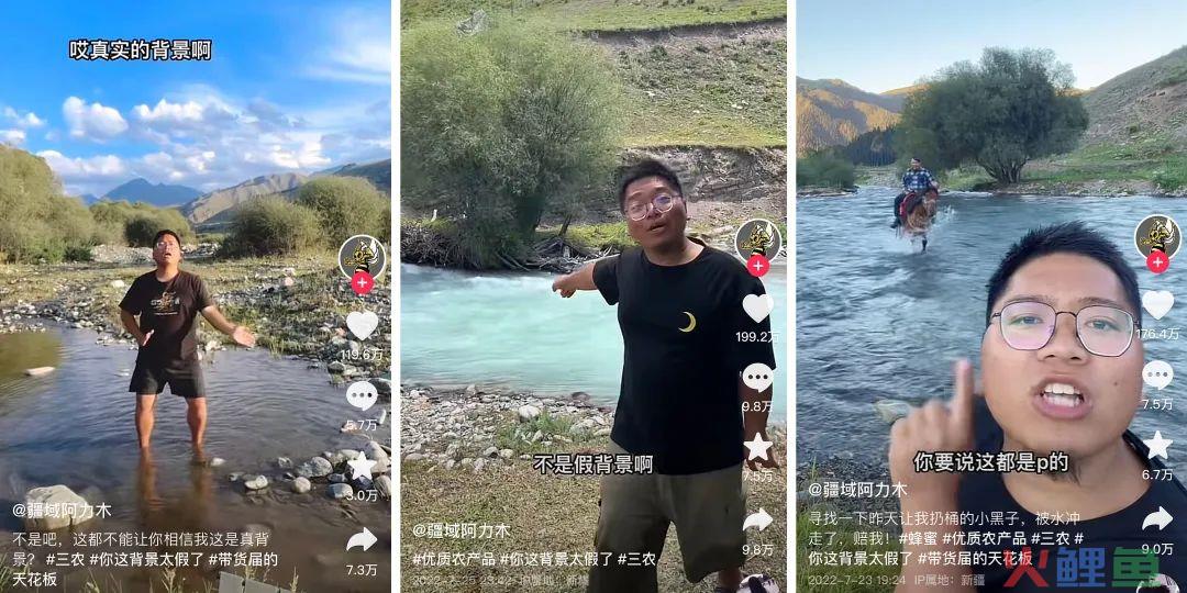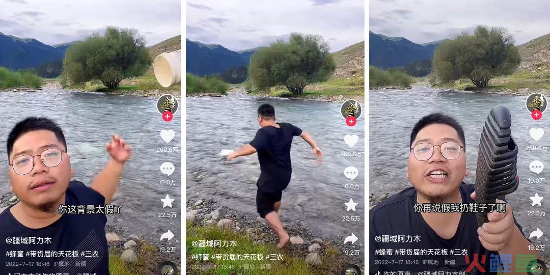 面对众多网友的质疑,阿力木不得不一遍遍地面对镜头自证清白:往河里扔桶、又慌忙跑到河中将桶捞回……这个片段被剪辑成短视频发在账号上后,播放量一路走高,点赞量也达到了260.6W,阿力木就此迎来了爆火,并吸引了各路剪辑大师各显神通入局玩梗,围绕着“你的背景太假了”的二创玩梗视频接连不断地出现: