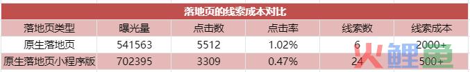 刚开始我们是用原生落地页投放,但是留下线索的用户很少,客户对于线索数据比较急迫,于是乎我们就用了小程序版。对比两种落地页的数据,原生落地页小程序版从线索数和线索成本的效果都是比原生落地页好,但是小程序版获得的线索质量没有原生落地页的高。因为如果填写了姓名且留下了电话号码,大概率是有了解这个楼盘的意愿。