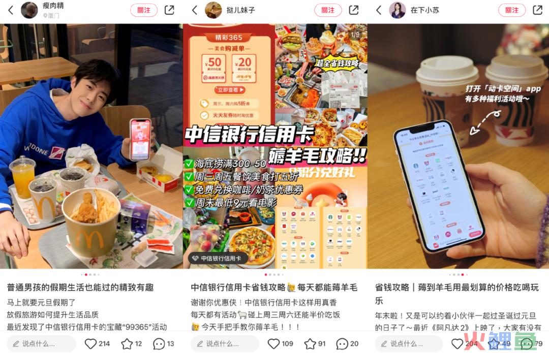 在被很多人当成搜索平台的小红书,中信银行信用卡则号召多为达人以内容种草形式,向大家分享「如何薅 99365的羊毛」,精美的画面中,露出真实的星巴克、喜茶、海底捞等合作品牌的优惠信息,让更多人对优惠活动有切身感知。