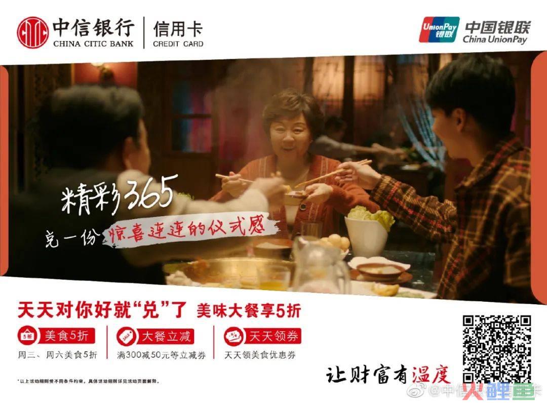 围绕全新口号,中信银行信用卡在原有的「99365」活动基础之上,推出了一部温情的TVC和一系列线上下传播动作,表达品牌对用户的关心和承诺,抢占用户对于「好吃、好玩、好看」领域的心智。