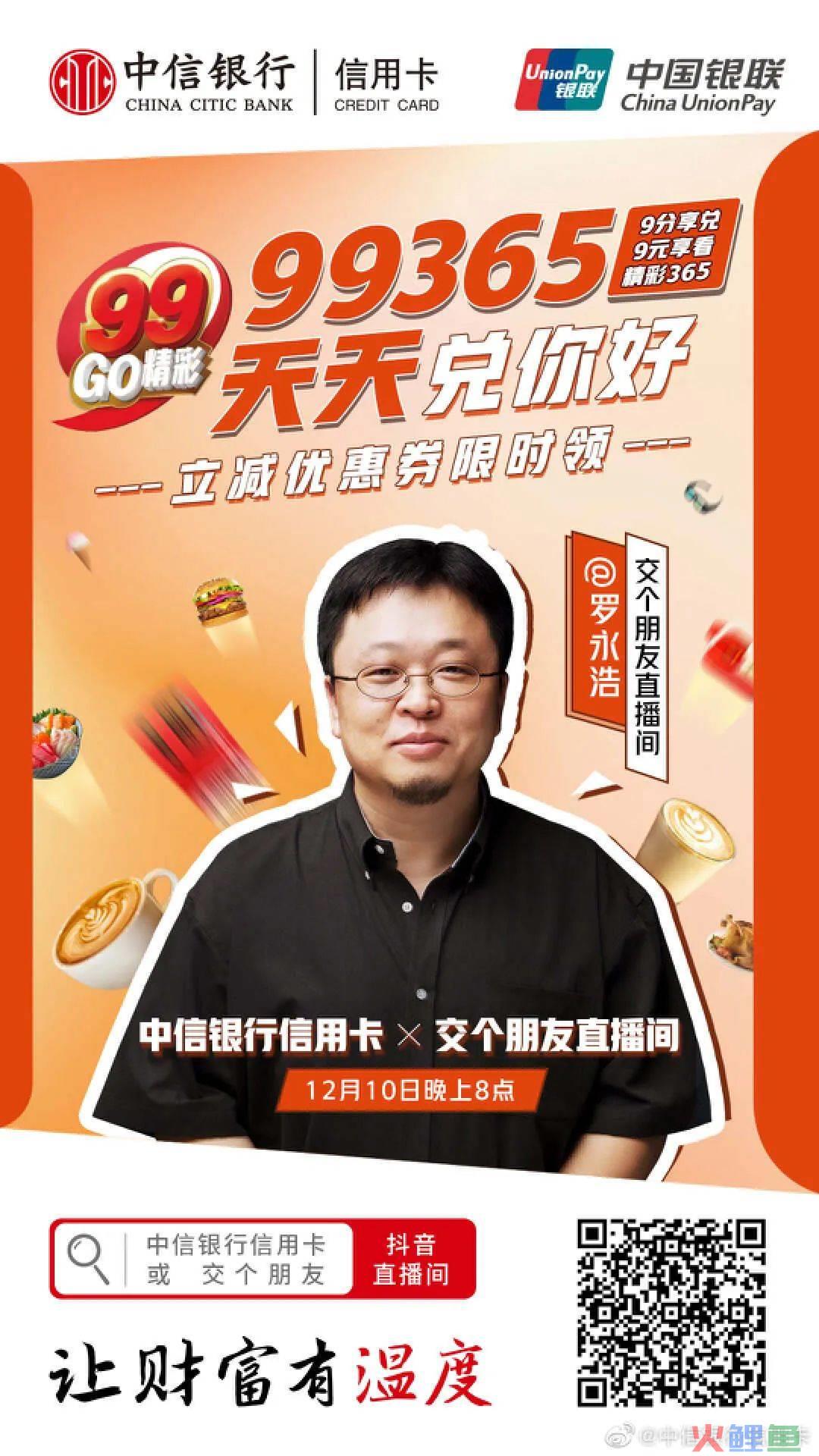 另外,为了强化品牌与年轻人的连结,中信银行信用卡锁定最近话题度十分火热的直播达人罗永浩,在交个朋友直播间进行99365活动的曝光和福利发放,限时发放的2万张优惠券在直播间内引起一阵疯抢,打开99365活动知名度。