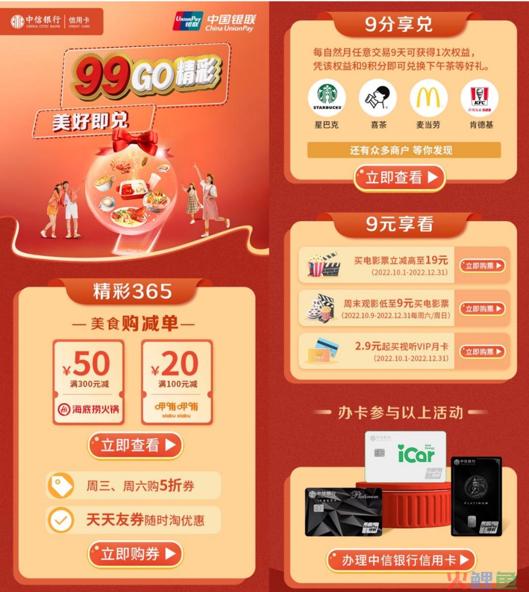 这呼应了中信银行信用卡的9元享看优惠信息,包含购2张电影票立减19元、周末观影9元起、2.9元起买视听VIP月卡,助力用户用极低的价格就能享受到电影的快乐。