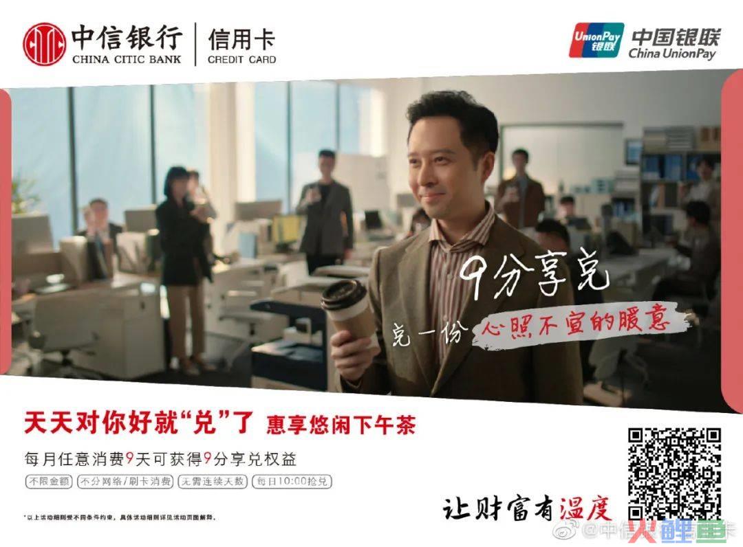 他没有因此心灰意冷,反而使用了中信银行信用卡的9分享兑优惠,即每月任意消费9天即可兑换咖啡、奶茶等好礼,主动请一大屋子里的同事们喝奶茶,巧妙地用9分享兑“我这杯是免费的”掩盖了自己的刻意,一下子完成了破冰,拉近与同事距离。