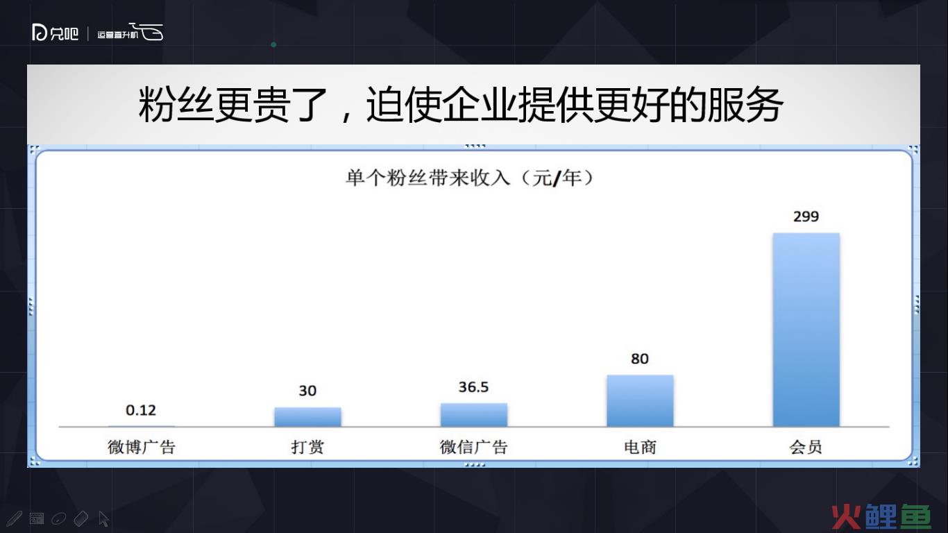 再换一个图,把单个粉丝帮助赚钱的概念,转化为单个粉丝带来的市值。因此当用户在这里有小圈子,跟更多人认识时,就会影响企业的市值。