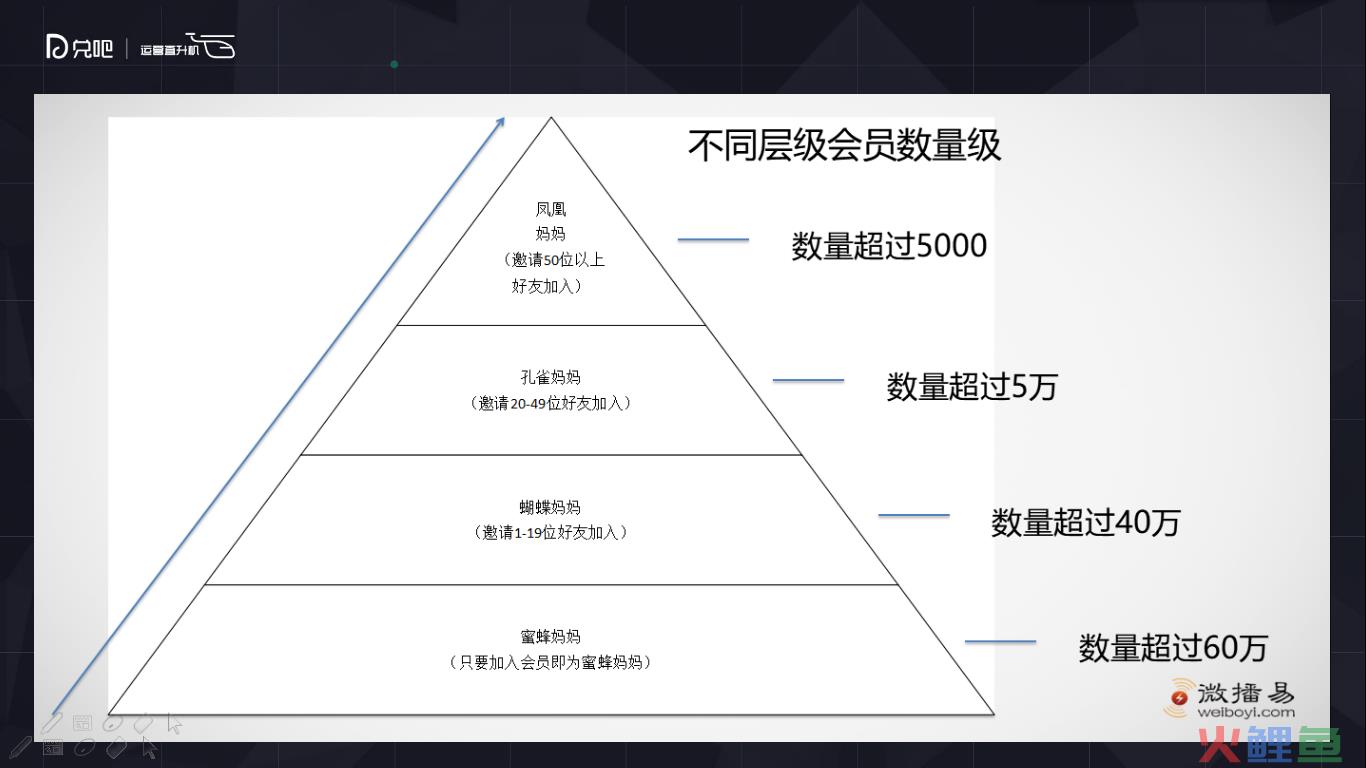 从第二层开始,平均一个妈妈(用户)帮大V店拉了十多个妈妈。最顶层别看只有5000人,但是这个层级他们称之为凤凰妈妈。最高的时候,一个人居然能拉来五千到几万个付费会员。这个事情当时让我们很惊讶。