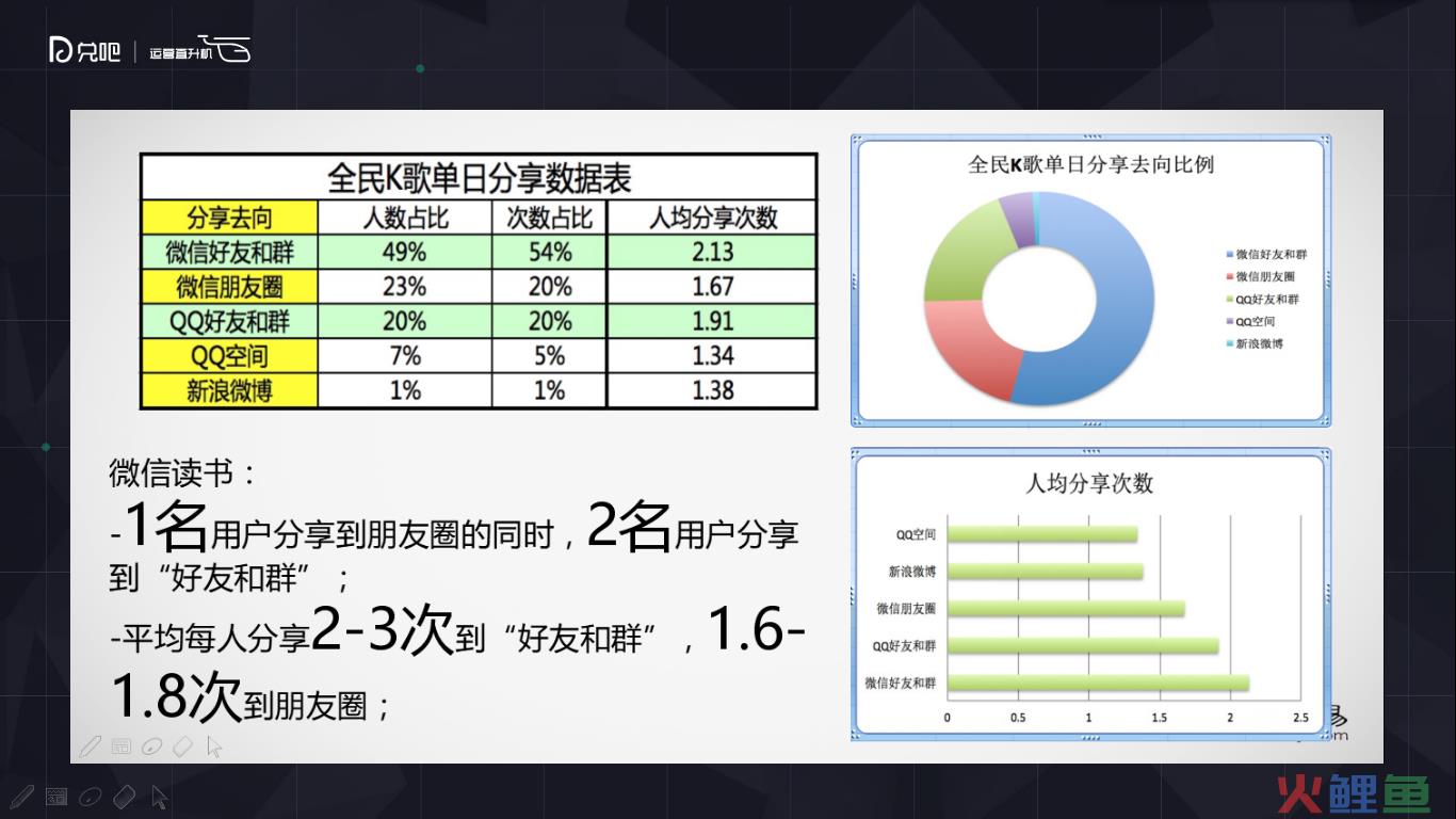 后来我们发现,全民K歌每天约15万的用户增量来自社交网络。表格显示,70%以上的用户愿意分享到群和好友。