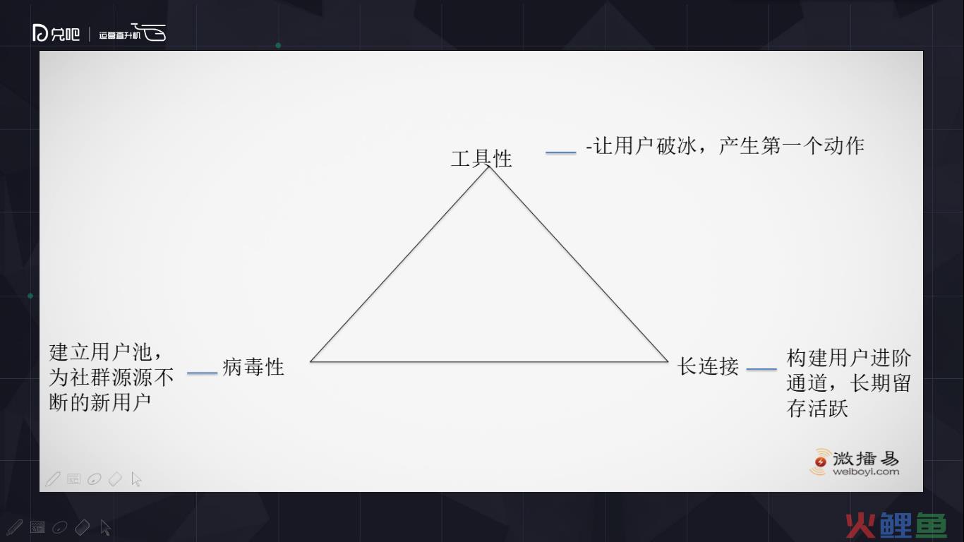 为什么事件驱动不如关系驱动?因为你没有认识的好友、没有关系在里面。所以许多社交公司首要准则就是不让单个用户进来,而是让他带着关系链进来,只要超过一定的好友数就活跃得很好。