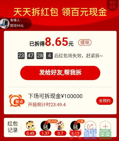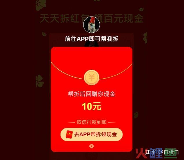 通过页面用户可以领到10元现金红包,但是10元不是马上能获取,而是自己拆一部分,比如:5块、6块这样的金额。没到拆10块怎么办呢?