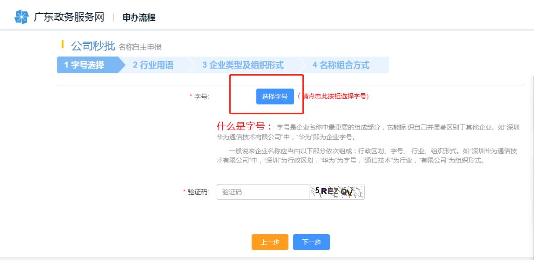 4. 进入公司名称核准环节, 一般说来企业名称应当由以下部分依次组成:行政区划、字号、 行业、组织形式。如“深圳华为通信技术有限公司”中,“深圳”为行政区划,“华为”为字号,“通信技术”为行业,“有限公司”为组织形式。