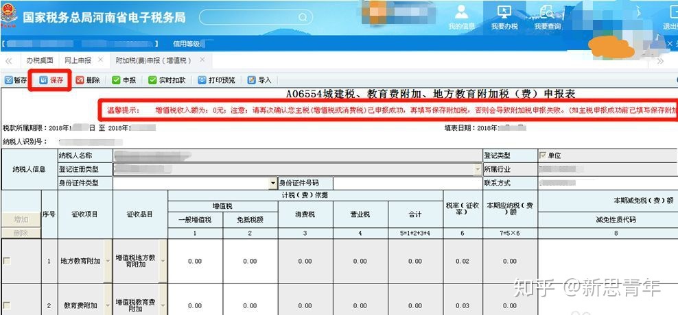 (7)因为增值税为零申报,所以,附加税直接零数据保存,点击“保存”。
