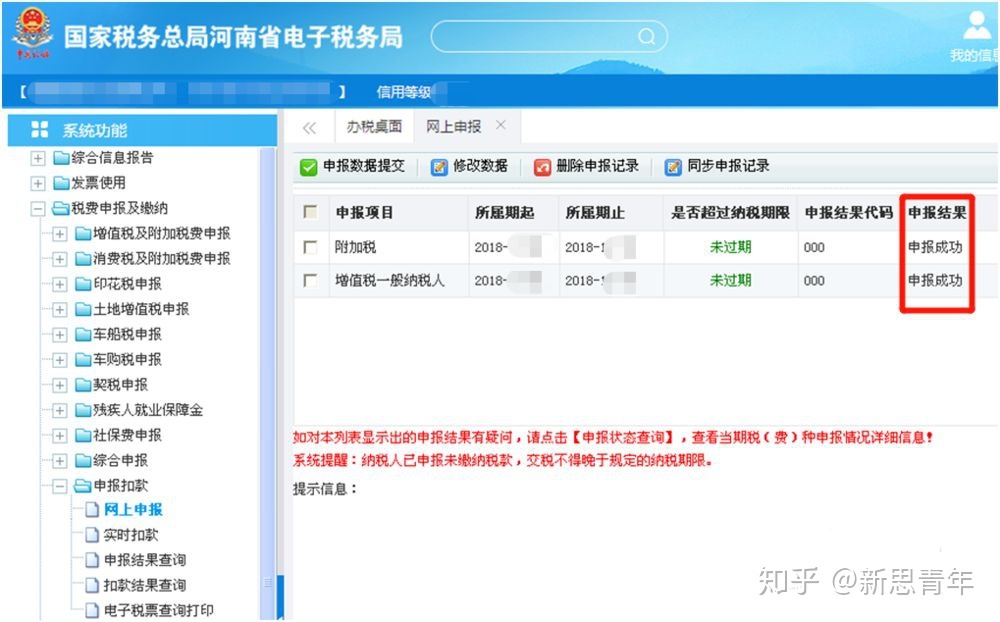 (10)申报成功后,在“系统功能”菜单中“税费申报及缴纳”—“申报扣款”—“网上申报”页面中,申报结果显示为“申报成功”。此时,我们已完成增值税和附加税的零申报工作。