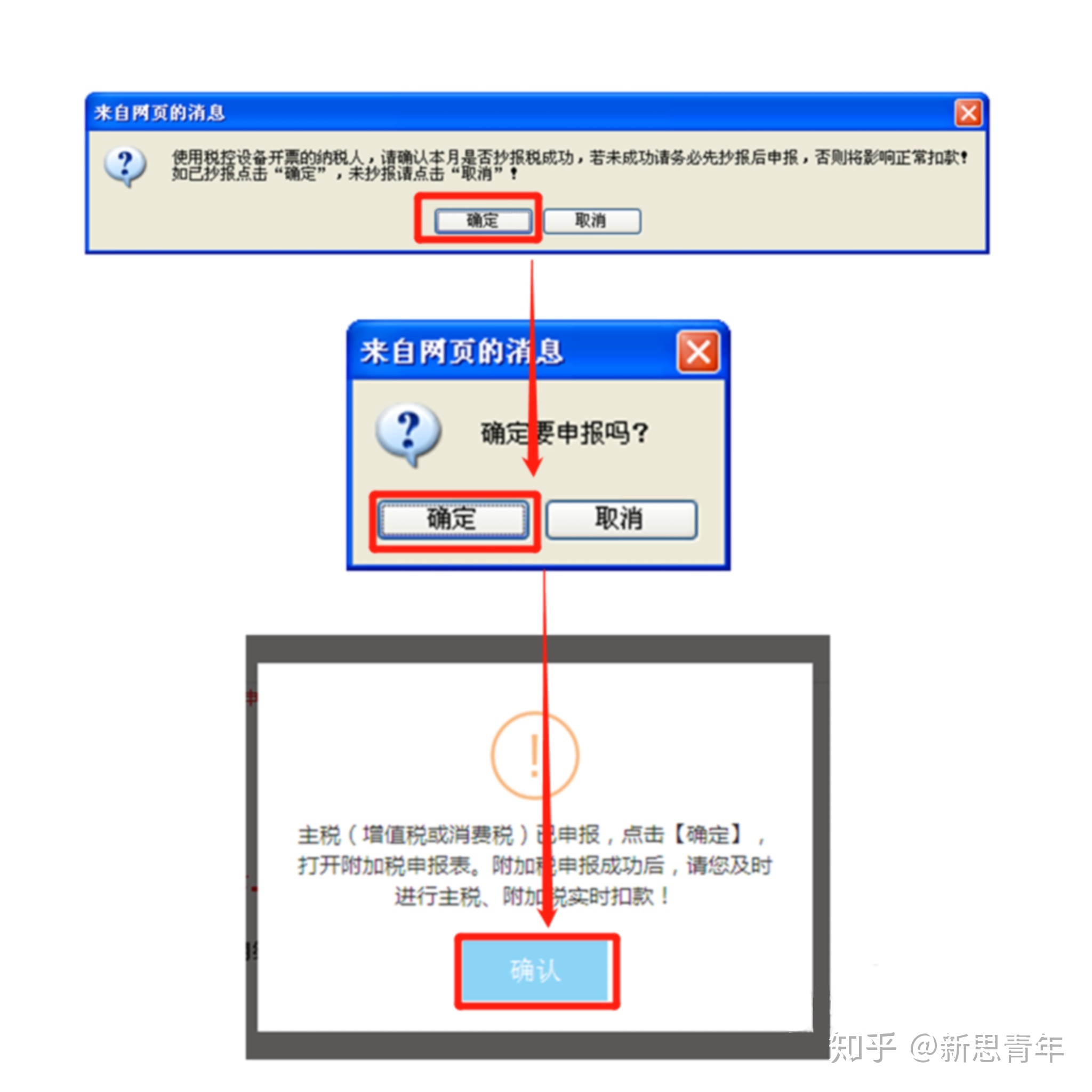 (6)点击网页消息中的“确定”,然后再次点击“确定”,“增值税”申报成功,点击“确定”,打开“附加税申报表”。