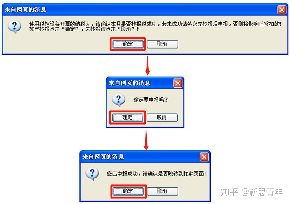 (9)在弹出的网页消息中点击“确定”,然后再次点击“确定”,再次弹出网页消息“您已申报成功,请确认是否跳转到扣款页面!”,因为是零申报这里我们可以点击“取消”,也可以点击“确定”跳转到扣款页面后再关闭页面。