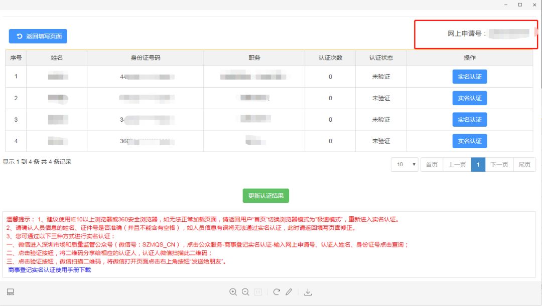 7.资料填写无误以后,提交申请表,进入实名认证页面。