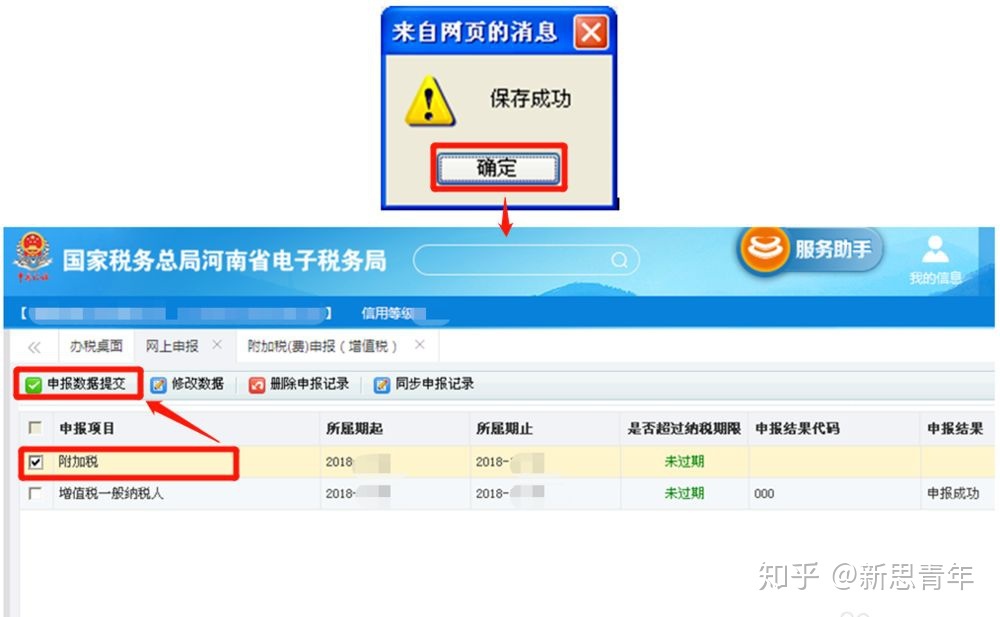 (8)提示“保存成功”,再次点击“系统功能”菜单中“税费申报及缴纳”-“申报扣款”-“网上申报”。勾选“附加税”后,点击“申报数据提交”。