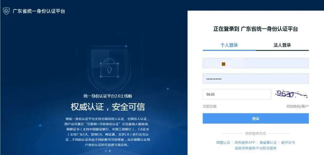 2.点击 我要申办 → 登录到 广东省统一身份认证平台,没有账号的需要注册账号登录。