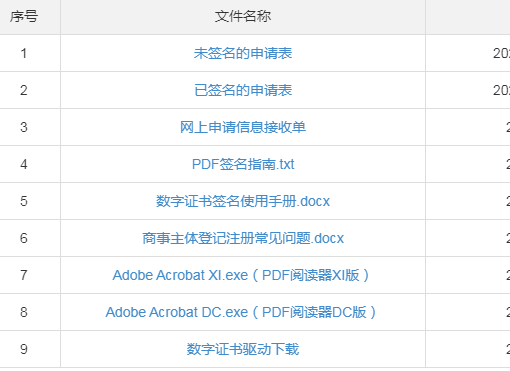 8. 下载未签名的申请表,以及各相关人员的数字证书对应驱动下载,需要使用Adobe Acrobat 阅读器打开申请表才可正常签名。