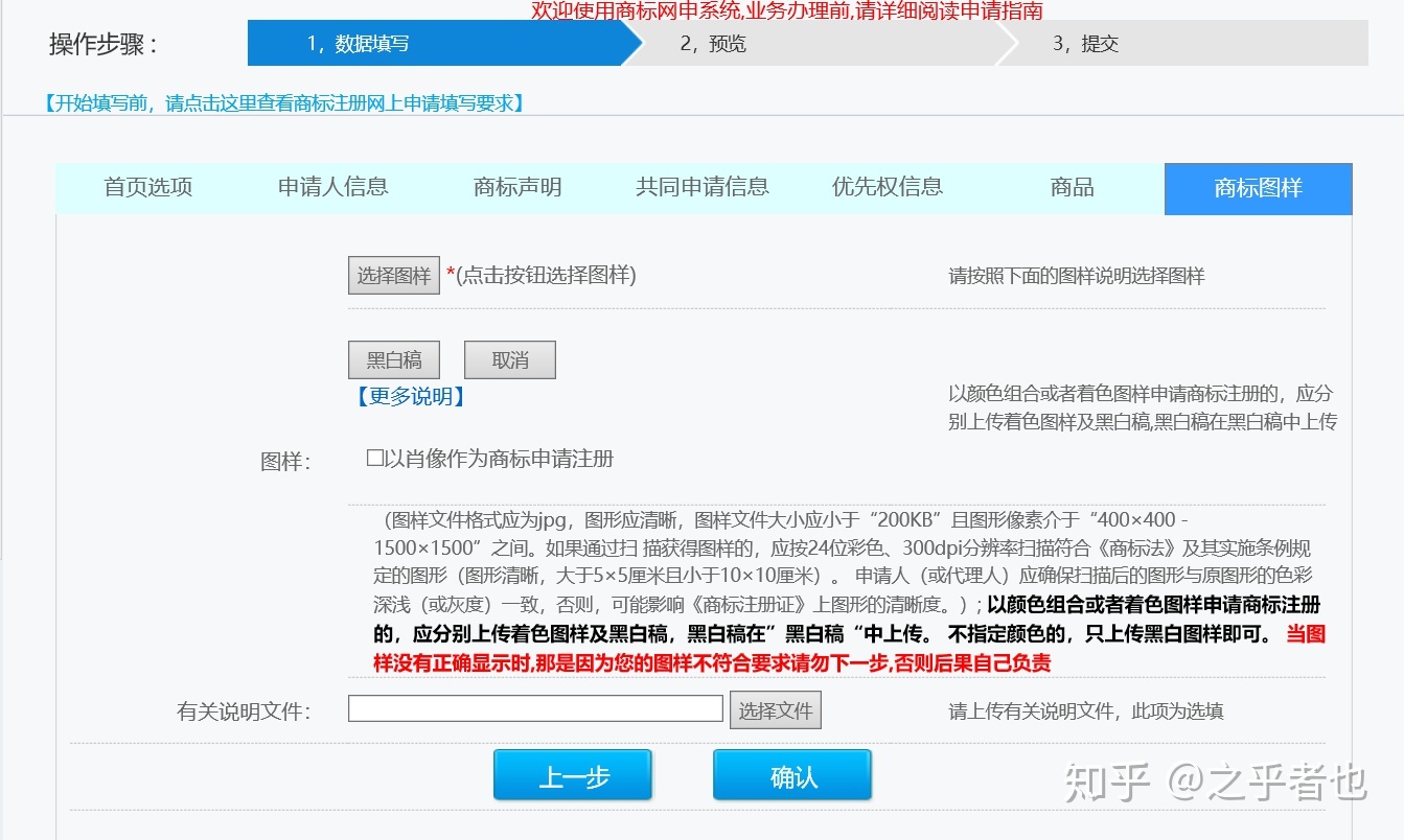 商标图样这里我卡了很久,有很多疑问,比如我只想申请的文字商标,这里要上传的图样商标是什么意思?该上传什么样的图样?上传图样后是不是后续我使用商标后只能用这个样式的了?等等。后来旁敲侧击的问了淘宝商标代理以及自己的摸索,发现即使是申请的纯文字商标,也是要图样的。只需要在word上用宋体(注意,为了后续版权问题,不建议用商用有版权的字体)写下你要申请的商标名,黑白即可,字体要大一点(48号加黑),截图后保存(图片大小要按照要求来)。