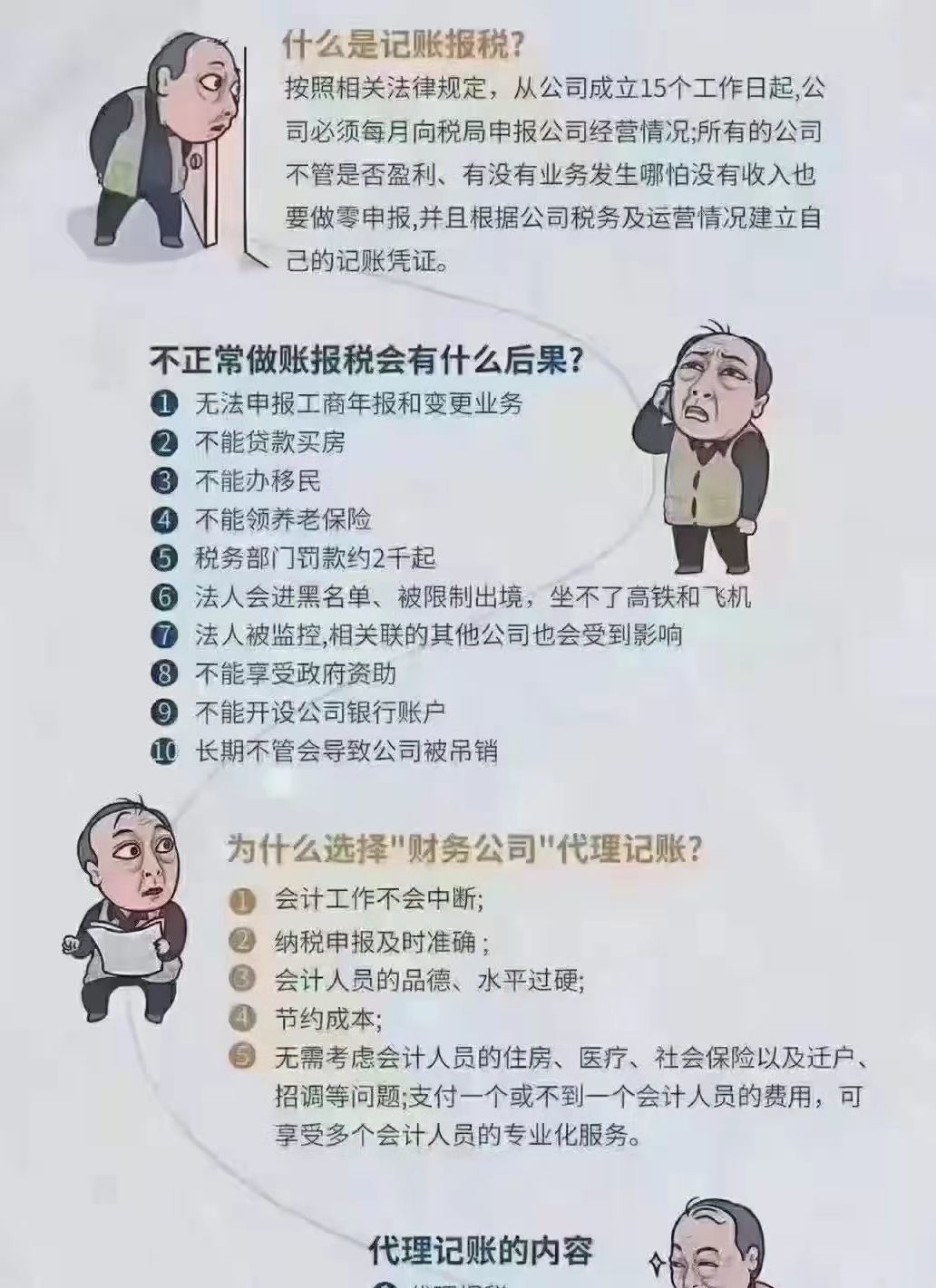 ☑不能贷款买房;☑不能办移民;☑不能领养老保险;☑公司每年会被税务局罚款2000至2万元;☑企业欠税,法人会被禁止出境,无法购买飞机和火车票;☑企业长期不报税,税务局将上门查账;☑长期不报税,发票机被锁;☑进入工商经营异常明了,所有对外申办业务全部限制;总之一句话,新注册公司不做账不报税,无疑是把自己往绝路上逼!一旦被查出来,公司将处处受限寸步难行!请三思而后行!!
